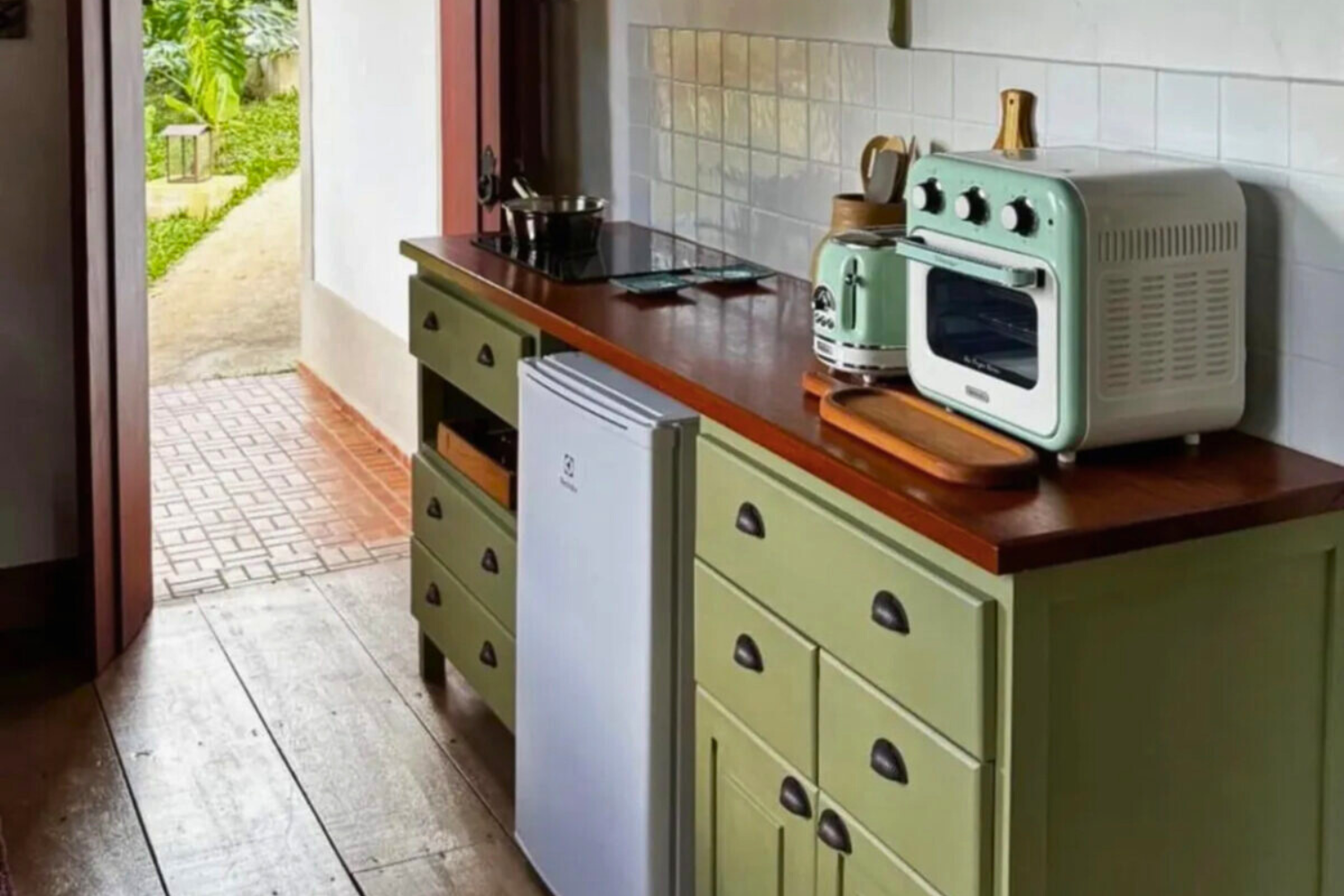 O interior da casinha é puro aconchego. A sala de estar possui sofá confortável, Smart TV e lareira, espaço perfeito para momentos tranquilos. Integrando o ambiente, a cozinha, equipada com frigobar, cooktop, forninho elétrico, airfryer e armários com utensílios necessários para o preparo de boas refeições.